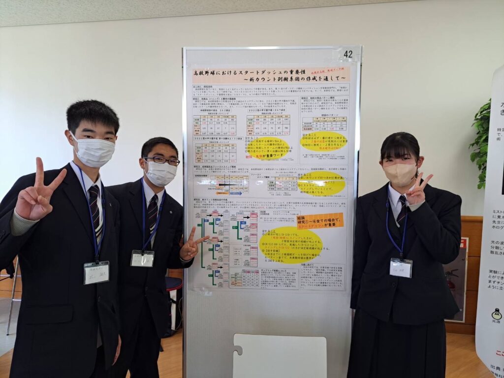 祇園北高校チームがファイナリストに選出されたという連絡が入ったのが2月13日(月)の朝。前日の日曜日に「令和四年度 広島県科学セミナー 第三回科学セミナー(発表会)」で、野球データ分析競技会にエントリーをしていた野球部のマネージャー3名が優秀賞を受賞した矢先だった。