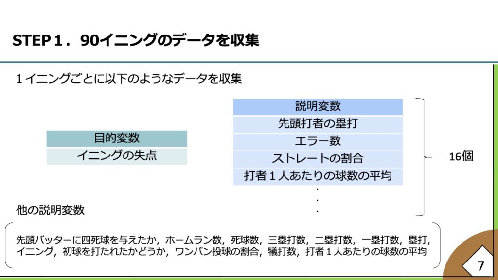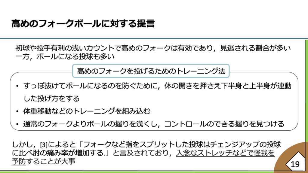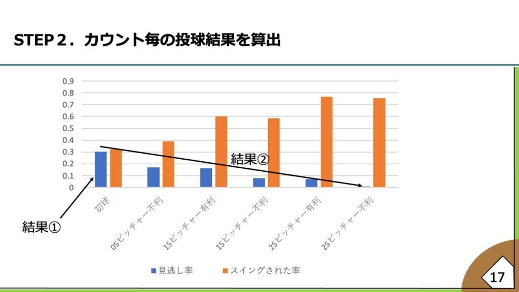 一発勝負のトーナメント制ではビッグイニング(3点以上の得点)を作られると約80%の確率で試合に負けてしまうことから、ビッグイニングを作られないことが重要だとした。どのような流れがビッグイニングを引き起こしやすいかを洗い出したところ、ボール先行の投球やストレートの被打率が高いとビッグイニングが起こりやすかった。そこで雨澤さんが「上原浩治氏と藤川球児氏がYouTubeで高めのフォークについて対談していた」と提案し、高めのフォークに着目してデータを分析していくことにした。テーマは《ビッグイニングを防ぐ高めのフォークの可能性》に決まり、初球や浅いカウントで打者の意表を突くのに高めのフォークが適していると分析した。