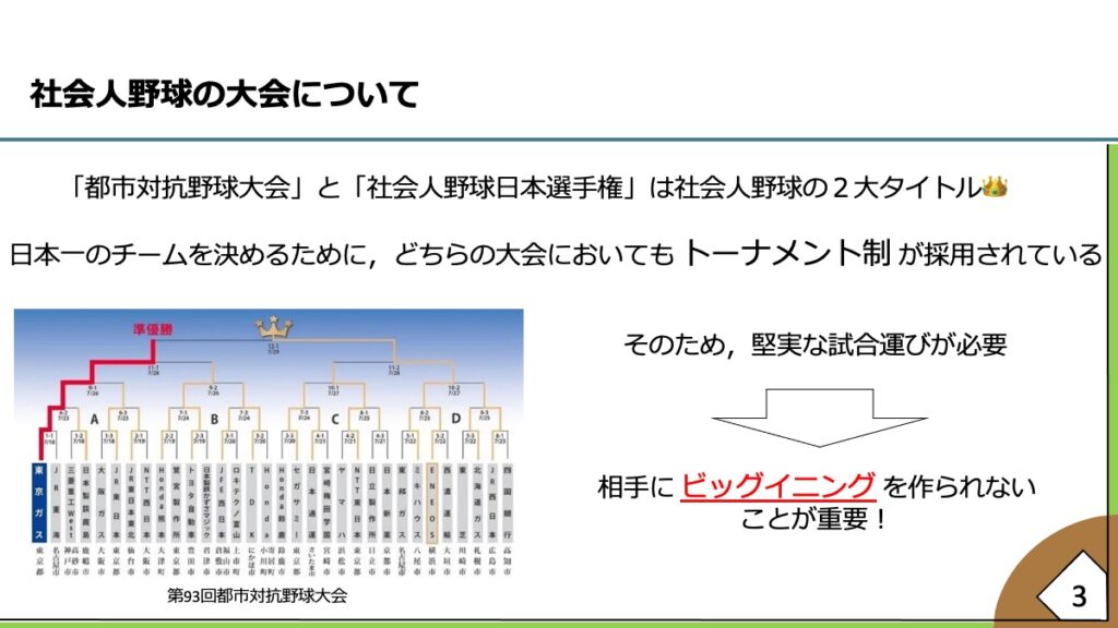雨澤さんは都合により現地参加ができず、遠隔での共同作業となった。22日午後4時から課題データに向き合い、社会人野球の特徴である「トーナメント制」に着目しようと決まったのが午後9時。