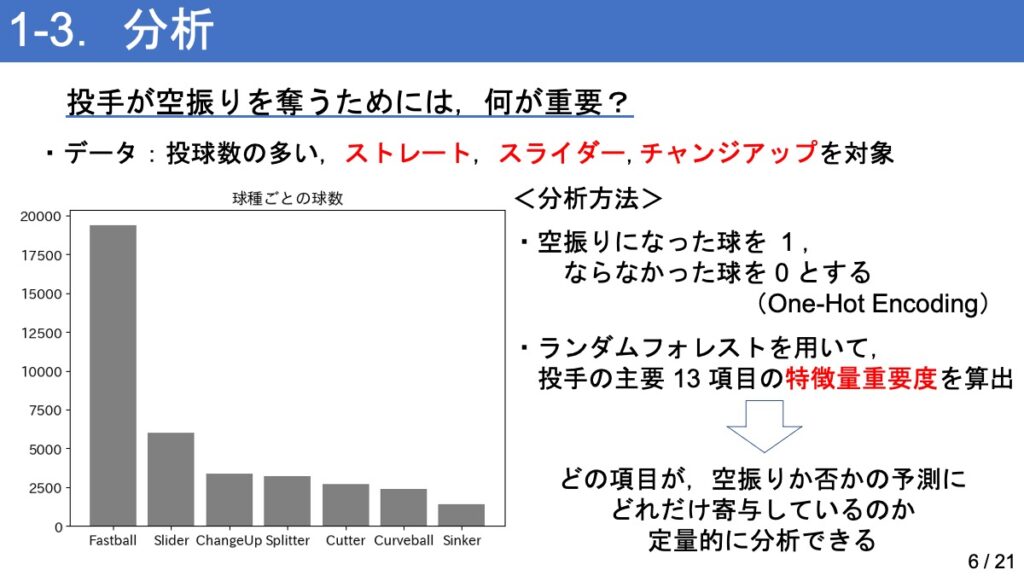分析にはランダムフォレストという手法を用い、投手の13個の指標それぞれで特徴量最重要度という指標を算出。これによって、各球種の投球において、どの指標が空振りという結果に繋がっているか定量的に分析した。