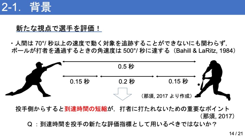さらに立命館大学大学院チームは、短い発表時間の中で新たな投手評価指標についての提言も行った。投手は球速や回転数などで評価されることが多いが、体格差まで考慮されるような評価指数はなかった。今回高岡さんは、「わかりやすい論理的な発表を行うために、先行研究の調査をしっかりと行うことを意識しました」と、これまでの先行研究からの抜粋をもとに “到達時間を投手の新たな評価指標として用いるべきではないか?”という問いを投げかけた。
