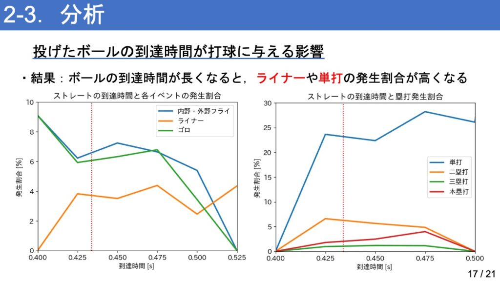 この問いのもと、与えられたデータの中から投げたボールの到達時間と各打球結果の関係性を分析。その結果、ボールの到達時間が長くなれば長くなるほど、ライナーや単打の発生割合が高くなるということが明らかになった。(下図)