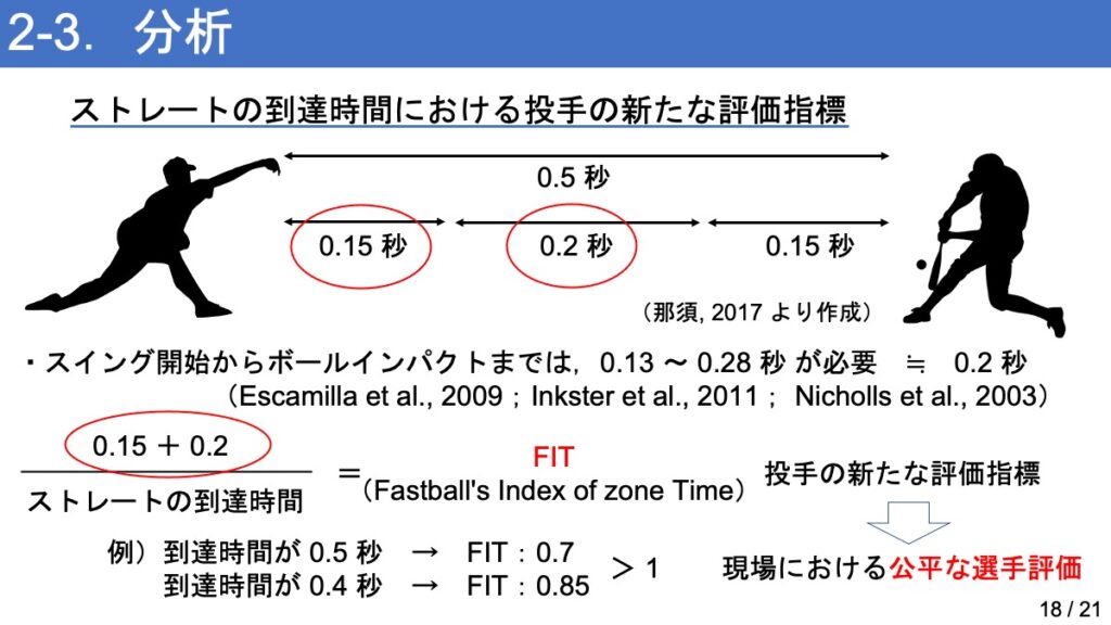 この結果を受けて、立命館大学大学院チームは球速、エクステンションといったこれまでの数値も大事であり、個々の体格に応じて球速とエクステンションの最適なバランスを模索することは必須としながらも、公平性の観点からFIT(Fastball’s Index of zone Time)(※1)の指標を現場で用いることが可能なのではと会場にプレゼンした。