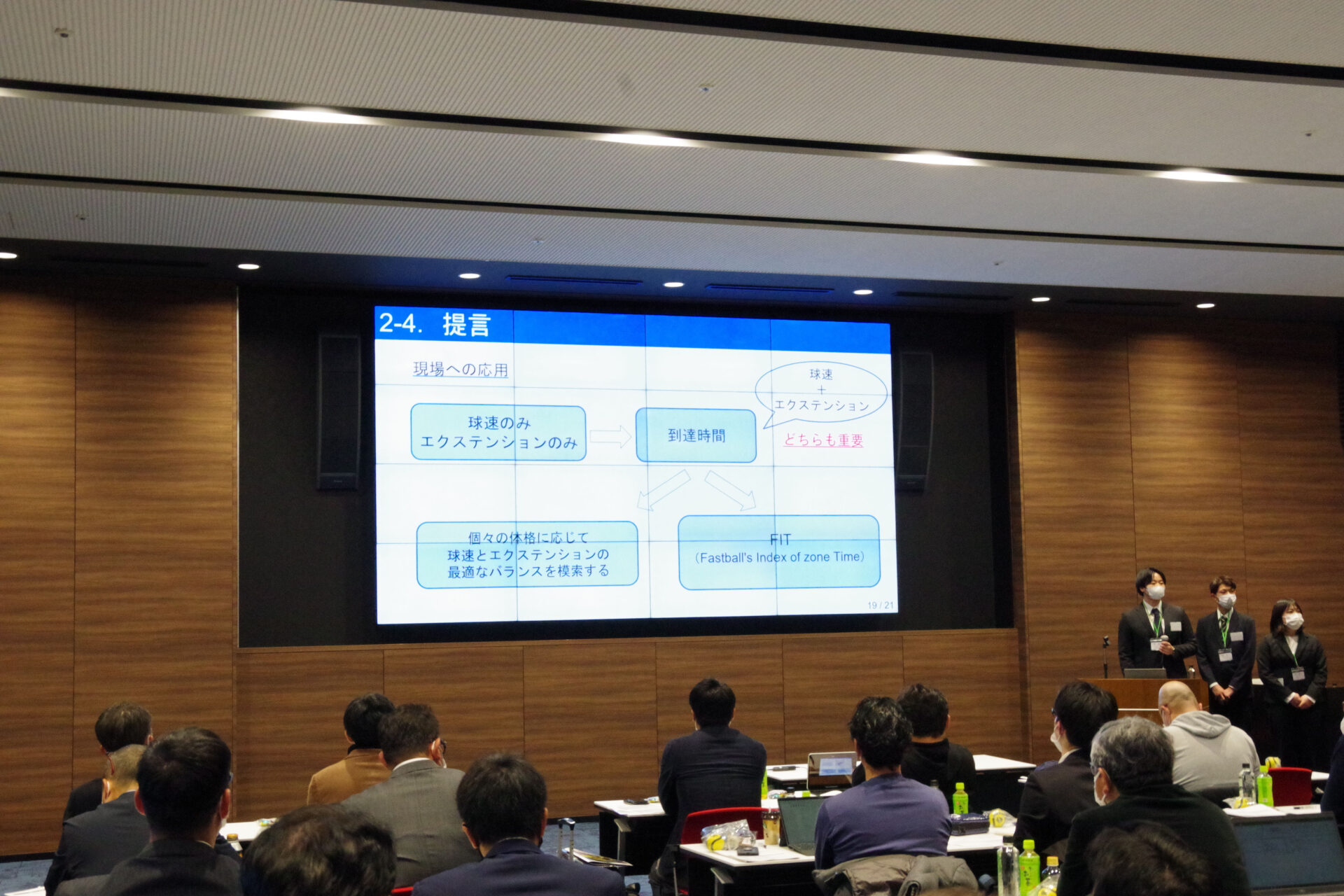 空振りが取れるボールに近づけるためのアプローチとストレートの評価指標を提言した今回の発表であったが、審査員からは「現場での活用視点として、個人が持つスマートフォンで動画撮影やスロー再生を挙げた点は、現場でも活用がしやすい点は評価できる」と一定の評価を得ることができた。