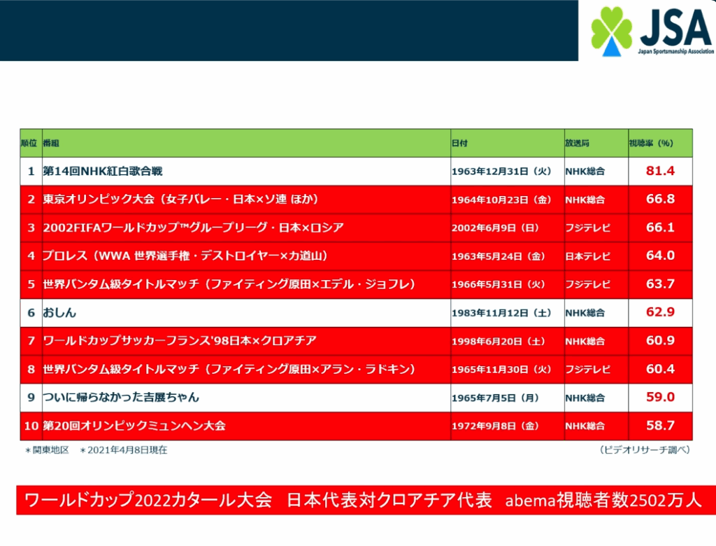 スポーツマンシップとは何か、なぜスポーツマンシップが大切なのか、そもそもスポーツとは、スポーツをする意義とは何なのか…講義の冒頭、森本氏は、まずスポーツの可能性についてさまざまな観点から言及した。日本国内でのスポーツの注目度が高いことの裏付けとして、テレビやライブ配信の数字に注目し、abemaTV「FIFAワールドカップカタール2022 決勝トーナメント 日本 vs クロアチア戦」の視聴者数が2,502万人に達したこと、ビデオリサーチ社調査において関東地区の歴代視聴率10位のうち、7番組がスポーツ番組であることを挙げた。さらに、プロゴルファー松山英樹さんのキャディである早藤翔太さんが2021年のマスターズ・トーナメント優勝時、ホールアウト後に一礼したことが賞賛されたことや前出のワールドカップでの「三苫の1ミリ」などを例に、スポーツには世界の人々を感動させ、勇気を与える力があることを説明した。