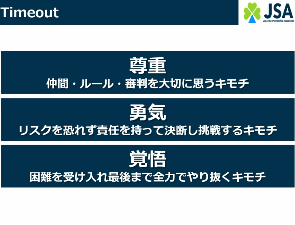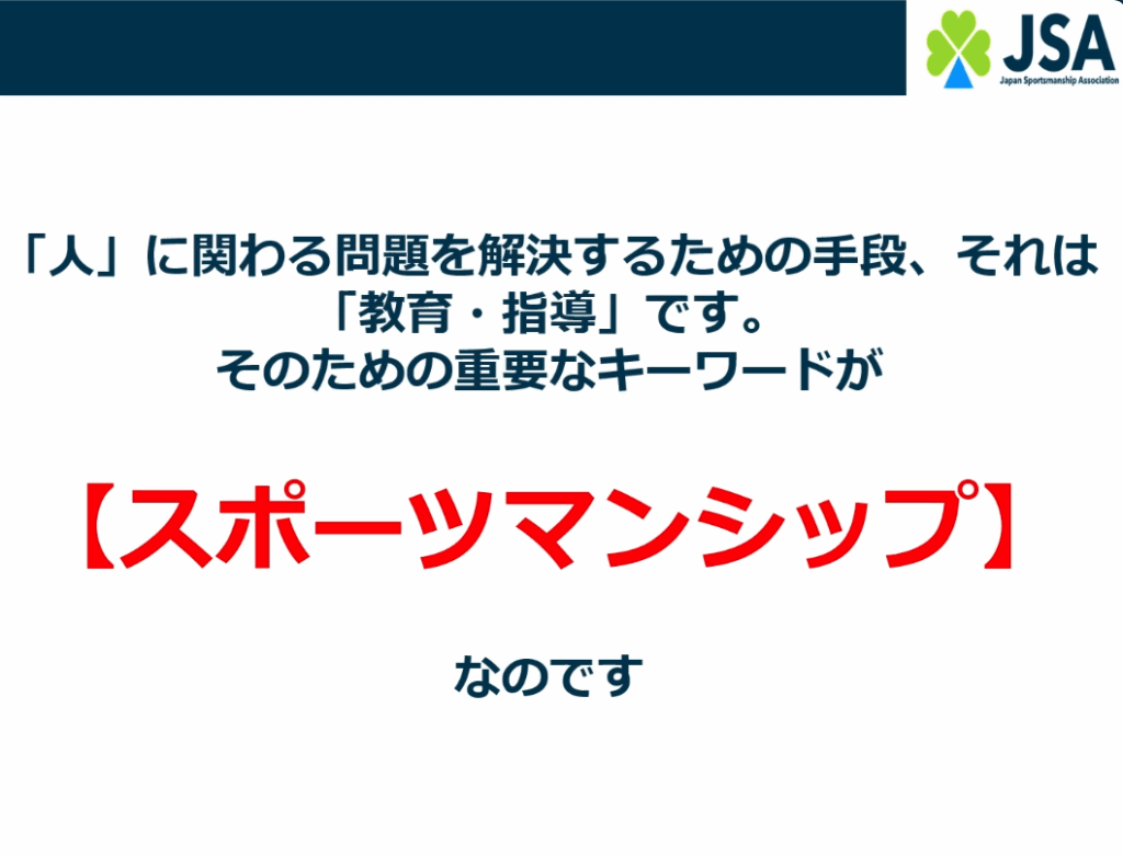 一方で、スポーツには、負の面があることも触れられた。度重なる体罰問題や勝利至上主義、ハラスメント問題、組織ガバナンス欠如、アスリートによる不祥事や犯罪、八百長疑惑、失言・軽率な言動、関係者による犯罪・不祥事など、さまざまな問題が起きており、「スポーツには、このように光と影、両方の側面があります。前出のスポーツ界の問題は、多くが社会問題と重なるものであり、全ての問題は人災、つまり人が関わるものなのです」とし、これらの“人”に関わる問題を解決するための手段が教育・指導であり、そのための重要なキーワードを「スポーツマンシップ」であると掲げた。