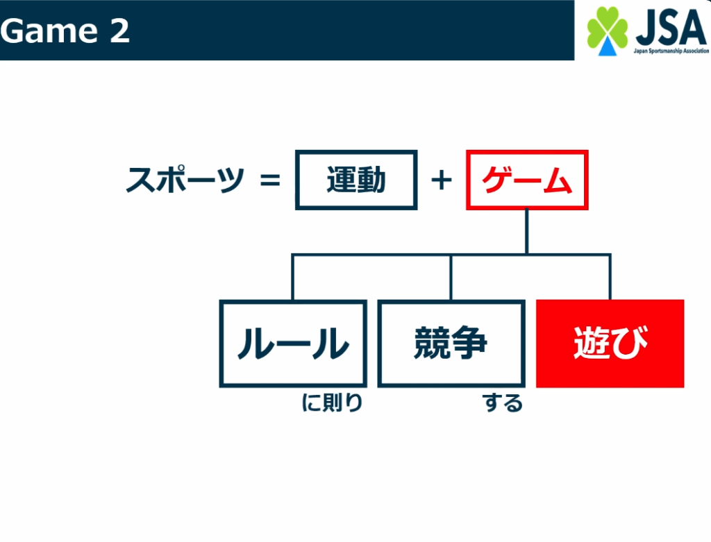 スポーツとは何か?上記の図を見ていただくとお分かりいただけるように、スポーツは「運動」+「ゲーム」である。またゲームは「ルール」に則り「競争」する「遊び」と言い換えることができる。英語では、「 Play Sports ! 」と表現されるように、スポーツは「遊び」であり、「遊び」は本来、愉しい(※1)ものだ。言い換えると、愉しくなければスポーツではないということになる。森本氏は、スポーツの語源がラテン語の「deportare」であることにも触れ、日本語で「「気晴らし」という意味であることから、スポーツは「自らPlayする真剣な遊び」であると定義し、こう続けた。