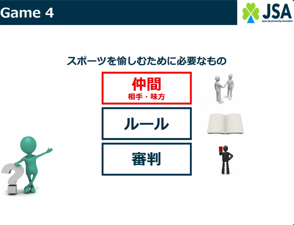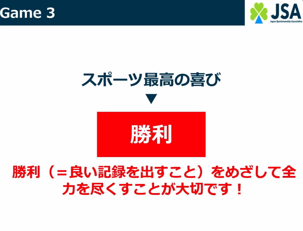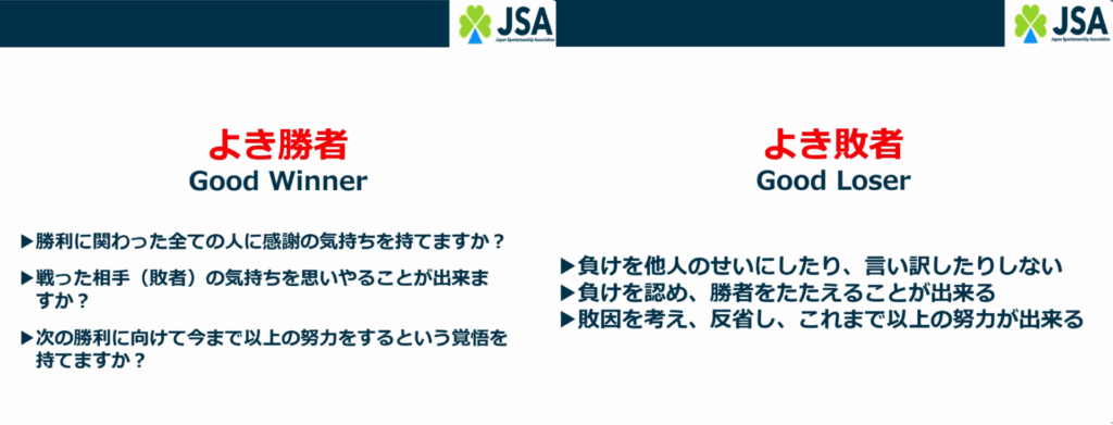 ● スポーツマンシップの考え方は、「今日の試合に勝つ」だけの考えではないこと、年齢に関係なく、学生生活、仕事、日々の生活においても大切なことであることを理解する。