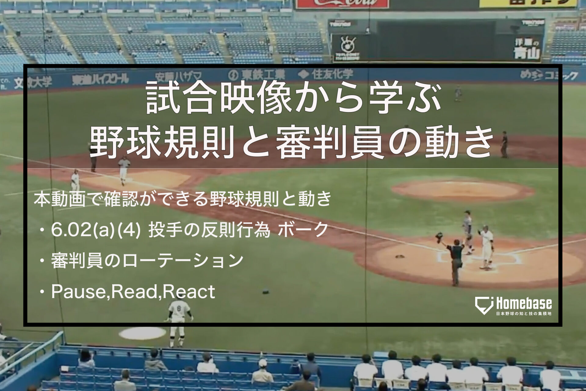 今回Homebaseでは実際の試合映像を見ながら、その時に起こったプレーとそれに伴う審判員の動きを解説していく。本企画ではBIG6.TVの協力により、東京六大学リーグの映像を使用している。また、解説として全日本野球協会(BFJ)アマチュア野球規則委員会副委員長の小山克仁氏の協力のもと、審判員として気をつける点をご説明いただいた。