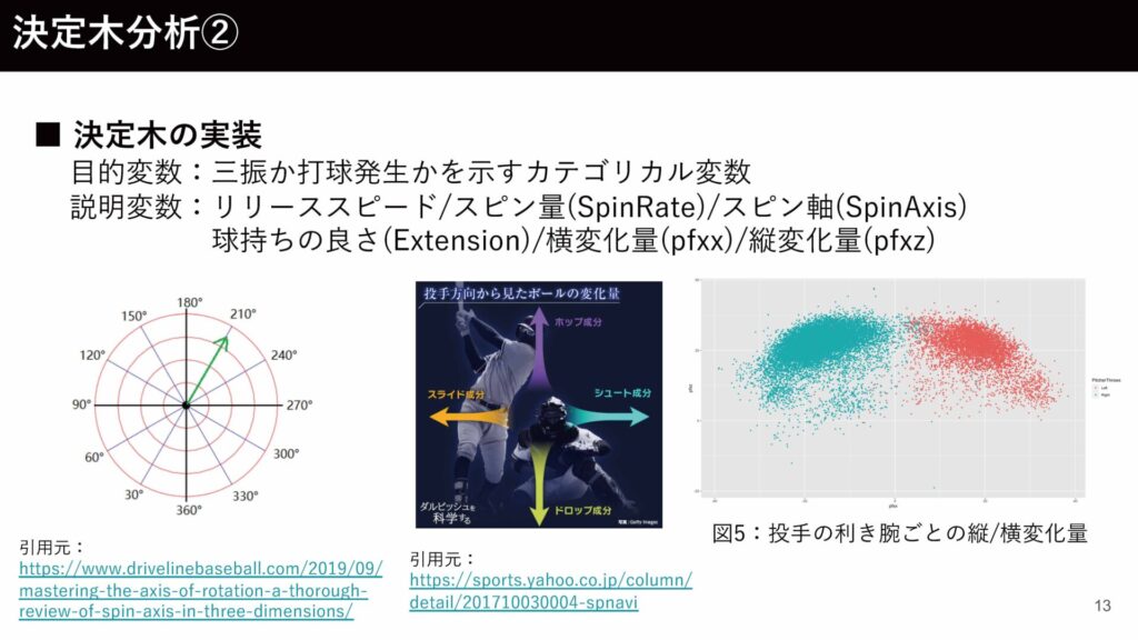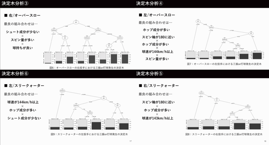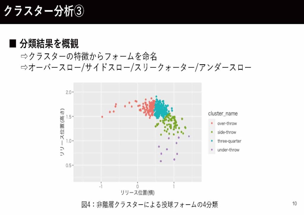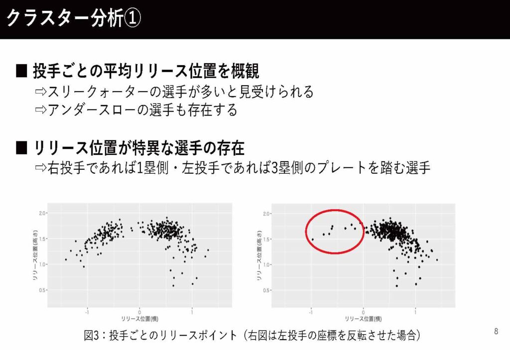 発表時間が足りず、最後まで発表できなかった部分に、現場への提言として、投球フォームを考慮した分析の可能性があるとし、フォームを機械的に分類、定義したものをさらに分析に活用できれば最適な投球フォームへの変更などにつながる可能性があると考えていると記載していた。