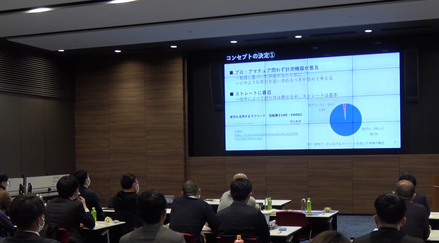 今大会はファイナリスト6チームに対して、決勝1日目・15時に課題となる社会人野球の主要大会で計測されたトラッキングデータを公開。各チームは宿舎で自由にテーマを設定し、検討・分析を行った結果について、翌2日目、12時よりプレゼンテーションを行うスケジュールで行われた。大会前は、提供データについて様々な発表が行われると想定されていたが、蓋を開けると全てのチームが投手についての発表を行った。