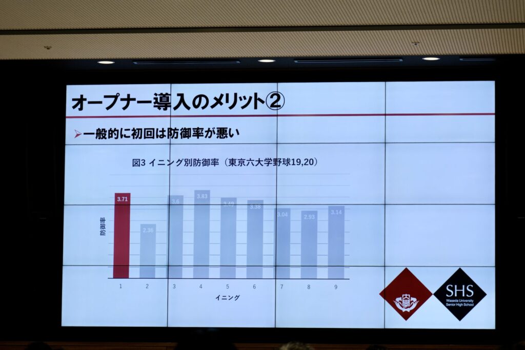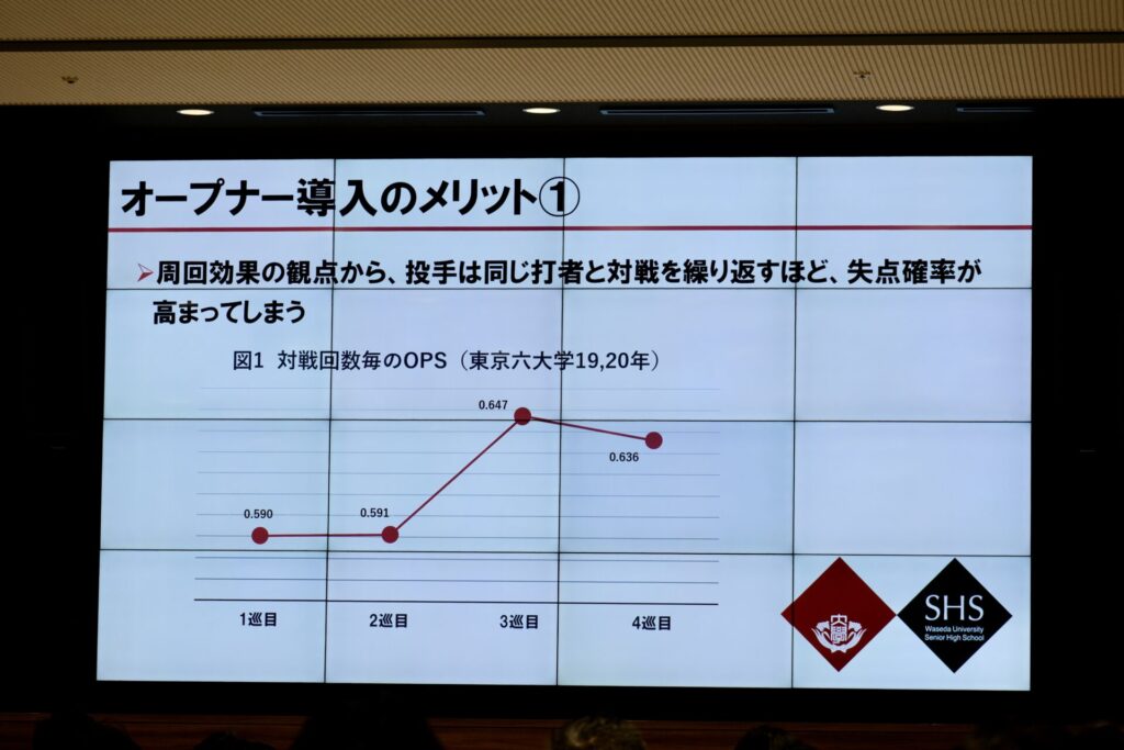 同志社大学の尾形寛太さん、金山幸暉さん、渡邉麻央さんのテーマは「逆境を味方に」。東京六大学は1チームあたり15試合と試合数が少なく、「選手のメンタルが試合結果を左右するのでは?」というのが研究背景だと説明された。
