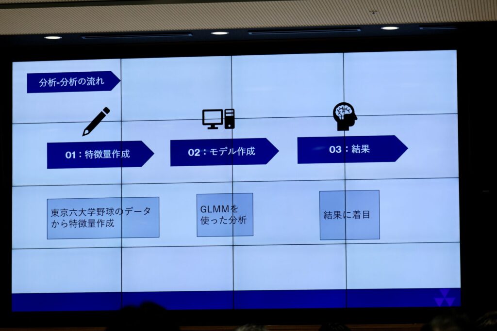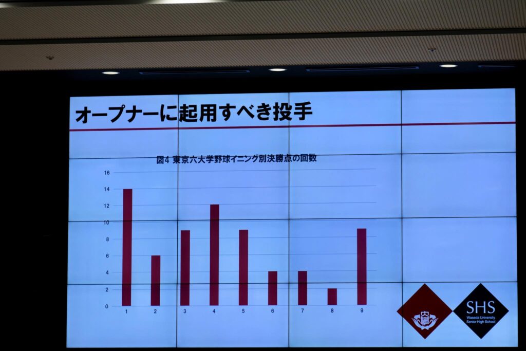 決勝に駒を進めたのが早稲田大学高等学院、同志社大学、北海道大学、高知工科大学、立命館大学大学院、東京農工大学の6チーム。決勝では東京六大学の計80試合のトラックマンデータから「野球の競技力向上」をテーマに分析し、発表が行われた。