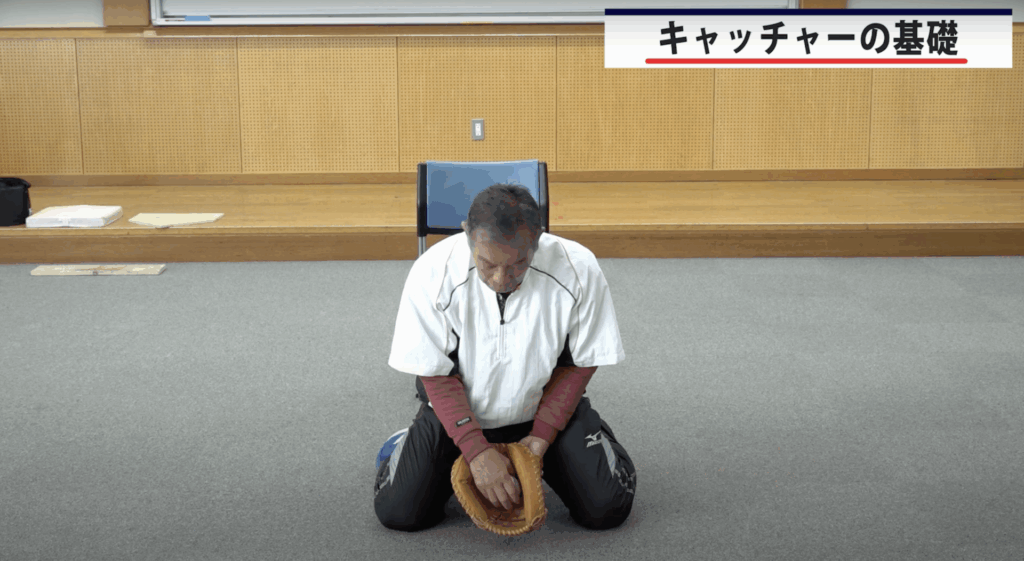 「基本はミットで捕りますが、ミットで捕れない時は体で止めにいかなければなりません。そのためには、しっかり膝を開きながら構え、ボールが来るまで顎を落として目線で追います」