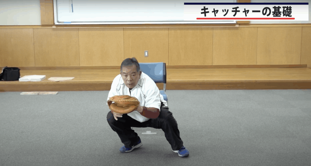 中尾氏はこの後、ホームベースの後ろにしゃがむように構え、姿勢について補足した。