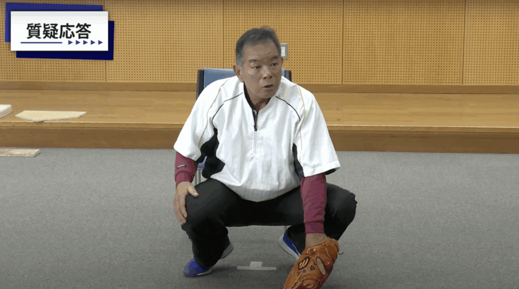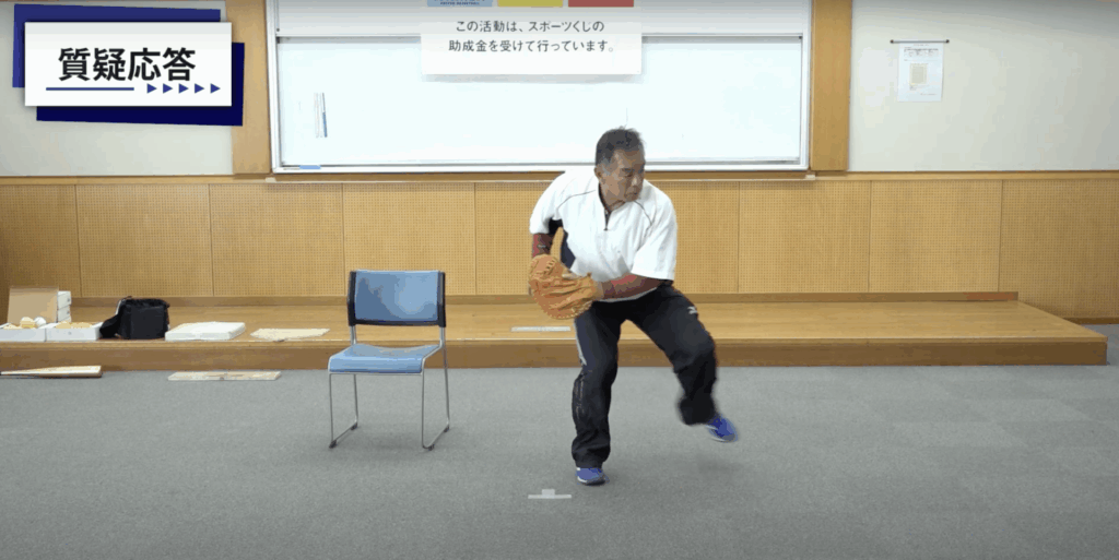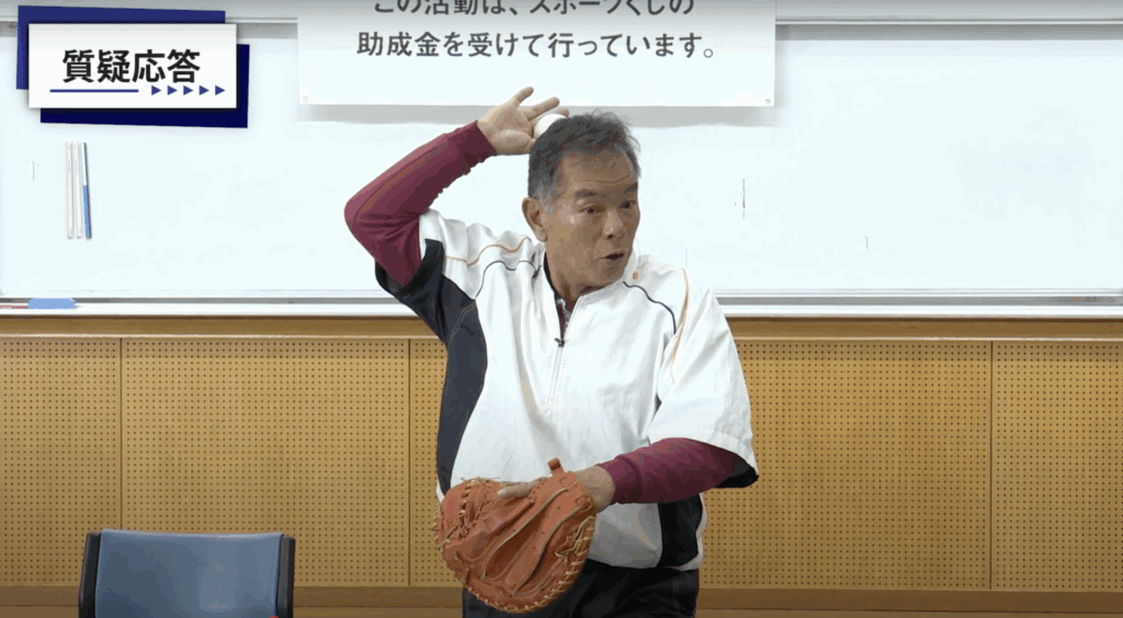 構えから捕球の動作を解説した後は、質疑応答へ。その一つとして、スローイングについての質問が寄せられた。