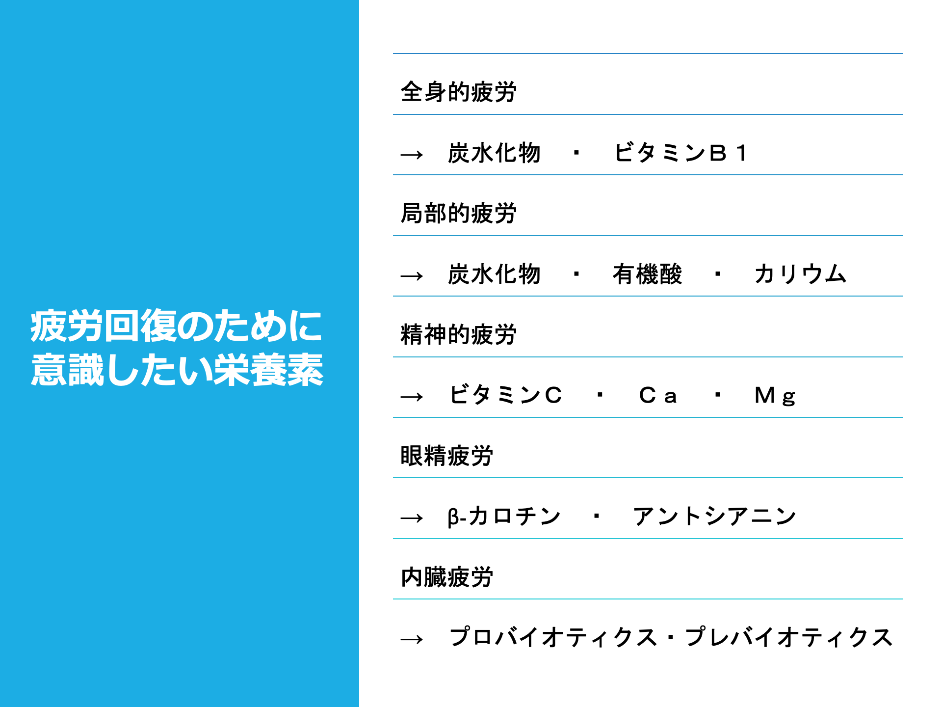 さらに、体の材料となるたんぱく質は常に充分な量を確保したいですし、汗とともに失いやすい水溶性のビタミンB群、C、ミネラル類も要チェックの栄養素です。