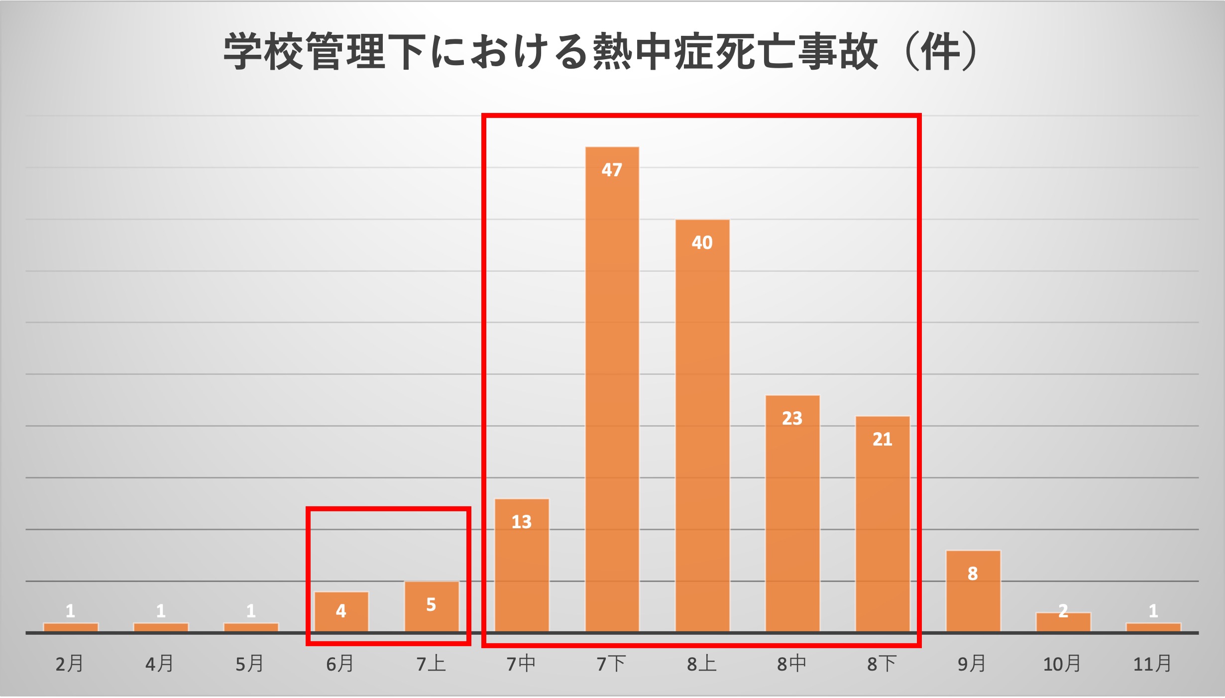 練習内容でいうと、ランニングやダッシュなど持久系や反復系の練習後に多く、発生時間帯では、気温が高くなる14時15時はもちろん、時間が長くなりやすい守備練習の終了間際など17時18時の発生も多くなっています。
