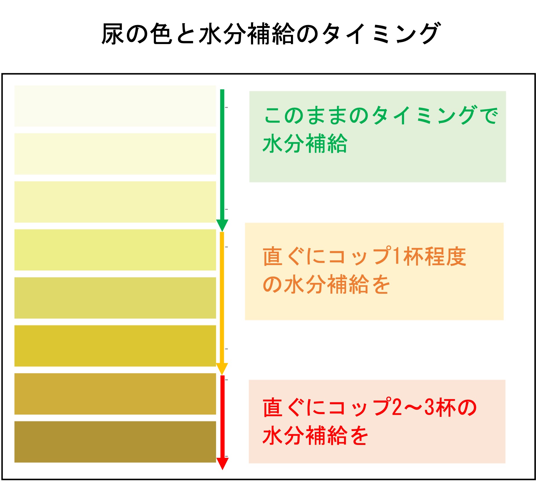 熱中症のリスクの高低を目で見て知ることができる指針があります。ひとつは、WBGT(暑さ指数)計による環境リスクの計測。もうひとつは、自分の尿の色による身体リスクの確認です(図3)。