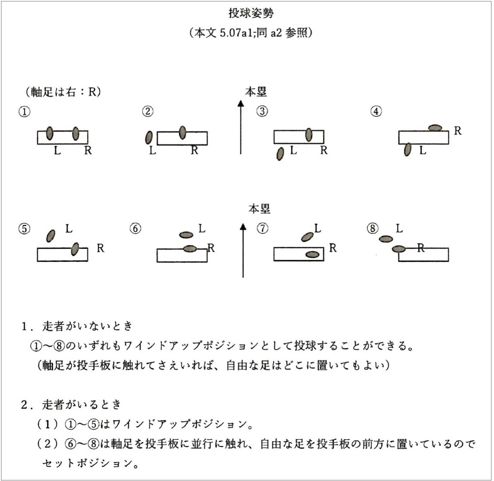 5.07(a)(1)(2)の改正に伴い、巻頭の「投球姿勢」の両足の位置に関する図を下記のとおり変更しました。