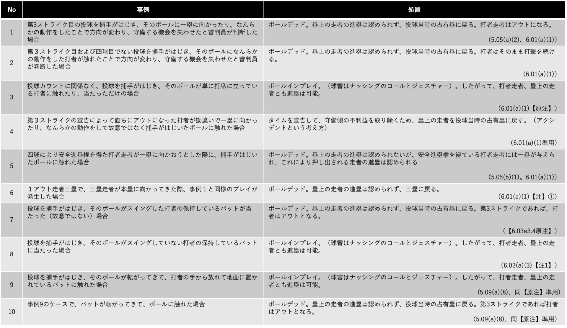 また、捕手に捕球されずに本塁周辺に転がった投球に対し、打者(打者走者)がなんらかの動作を伴ったことで触れてしまった場合は、打者(打者走者)がボールに触れた場所(打席内か否か)や、タイミング(一塁に向けて走り出す前か後か)などには関係なく、ボールのそれた距離や方向によって、捕手の守備機会を失わせたと審判員が判断すれば、そのときのボールカウントに関係なく、ただちにボールデッドとなり、塁上の走者の進塁は認められないことが明確になりました。