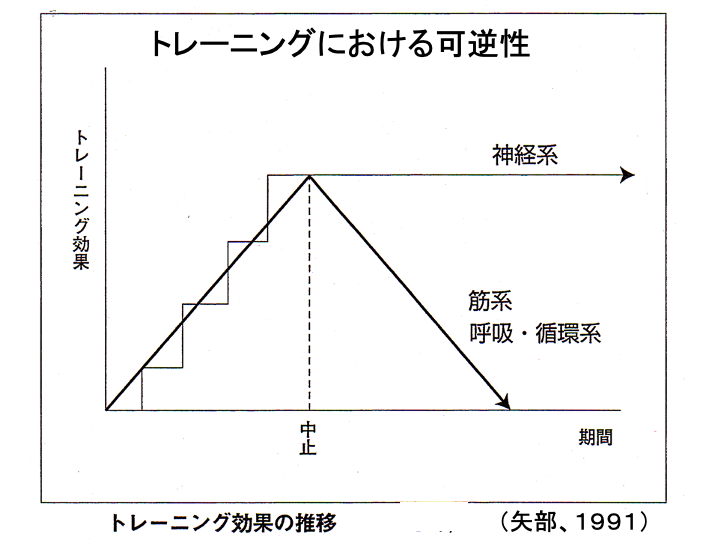 技術のトレーニング(神経系)と体力のトレーニングを比較すると、技術のトレーニングは可逆性が低く、階段を登るように向上していき、トレーニングをやめても効果が残る傾向があると言われている。