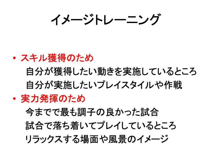 イメージトレーニングには、①スキルや技術の獲得②実力の発揮という二つの大きな目的がある。