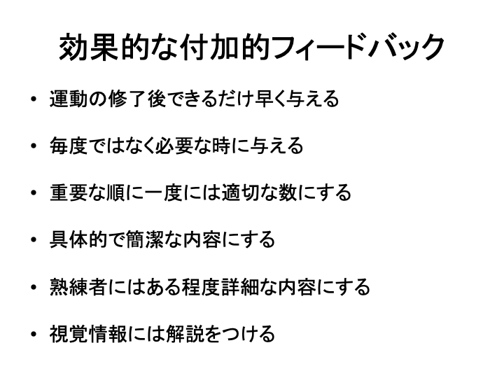 フィードバックは、内在的↔︎付加的フィードバック、身体の動き↔︎運動の結果のフィードバックと分けることができる。指導者に関連する付加的フィードバックでは下記内容を意識することが重要である。ぜひ参考にしていただきたい。