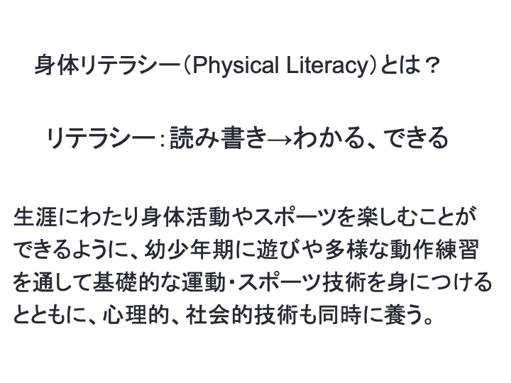前述の通り、神経系は幼少期のタイミングで最も発達すると言われている。しかし、心理的や認知的な準備が幼少期にはまだ十分に身に付いていないため、保護者や指導者などの周囲のサポートが必要である。幼少期に重要なのは多様な動作を経験させることであり、身体リテラシーを身につけることが将来のスポーツや身体活動の楽しみにつながっていくと考えられている。