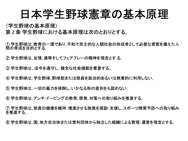 この学生野球協会が、統制令解除(1947年)後に自主的な運営を目的として制定したのが学生野球憲章で、1950年に制定された。学生野球憲章では、学生野球を教育の一環とし、友情、連帯、フェアプレーの精神を理念とし、法令遵守、健全な社会規範尊重、政治的・商業的利用の排除、暴力と差別の排除、アンチドーピングへの取り組みが強調されている。