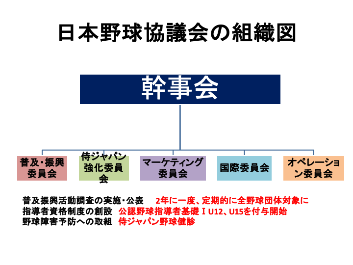まずは下記図をご覧いただきたい。年代やカテゴリーに分かれて様々な団体が協力し合って今の野球界が成り立っていることが分かる。