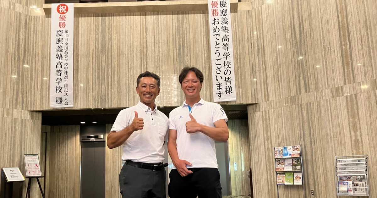 2023年8月、甲子園大会で慶應義塾高校が優勝し興奮冷めやらぬ翌日、宿舎へ祝福に駆けつけた阪長氏(写真提供:阪長氏)