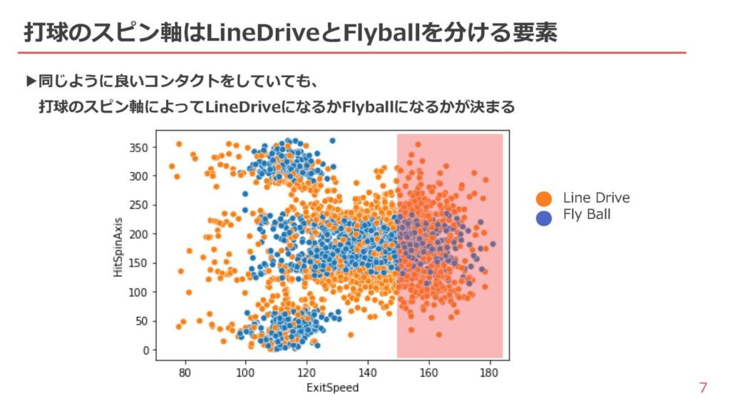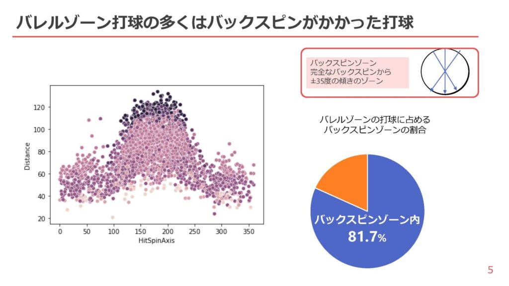 長打が出やすい打球速度と角度の範囲を示すバレルゾーンの打球は、約8割でバックスピンがかかっていることが判明。さらに、回転数と回転軸がどの程度飛距離に影響しているかを先のデータから調べた結果、以下2つの結論を導き出した。
