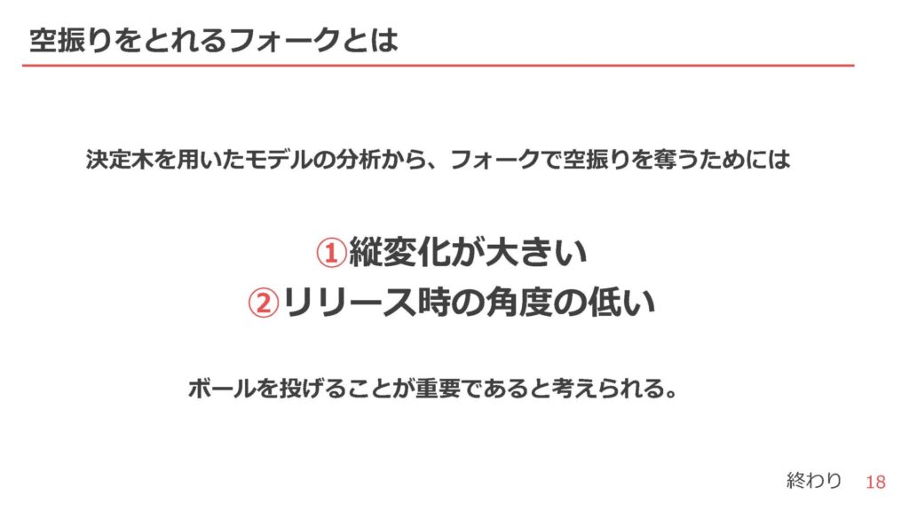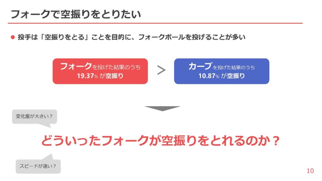 続いての分析は、空振りの取れるフォークについて。このテーマを選んだ理由を「投手力の向上を考えた際に、こういうボールを投げたいという投手の気持ちをデータから導くことができれば」と話し、フォークボールに着目し分析を行ったと説明した。