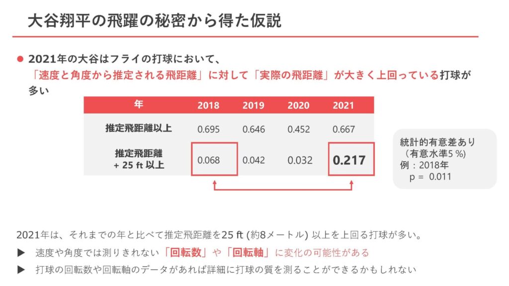 大会当日は最後の発表となった横浜市立大学大学院チーム。彼らは「スピン軸に着目した打球の分析傾向」と「空振りを取れるフォークについて」を課題に挙げてデータ分析を行った。最初に「スピン軸に着目した打球の分析傾向」について説明を始める。まず仮説として、昨季メジャーリーグで大活躍した大谷翔平選手が過去4年で放ったフライ打球に着目。2021年シーズンは、他シーズンに比べて速度と角度から推定される飛距離より実際の飛距離が上回ることが多かったという。具体的な数字を見ると、25フィート(約8メートル)以上も上回る打球が多かったのだ。このことから速度や角度では測りきれない「回転数」や「回転軸」に変化があったのではないかと分析。打球の回転数や回転軸のデータから打球の質を詳細に測れるかもしれないと考えたという。この仮説は、「MVP大谷翔平、飛躍の秘密」がテーマだった書類選考の際にも用いられたもの。そのため発表前には、「トップチームの選手の課題は難しかった」との本音も漏らしたが、わかりやすいデータを最初に提示することで、聞く人の興味を引いたことは間違いないだろう。