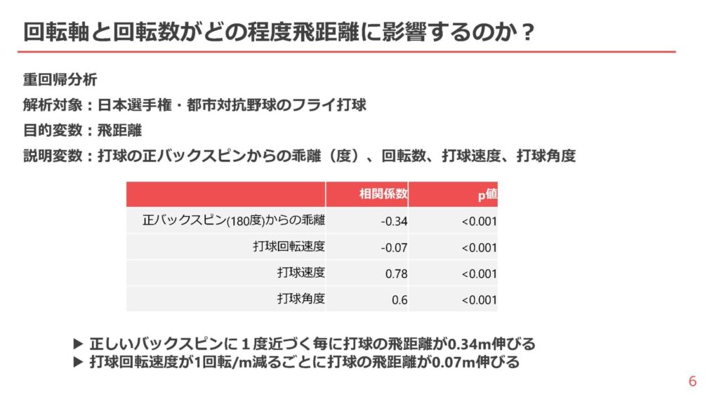 数値だけを見ればわずかな伸びに思えるが、打球飛距離には打球の回転数と回転軸が大きく関わっていることを示す大きな分析結果であることには間違いない。