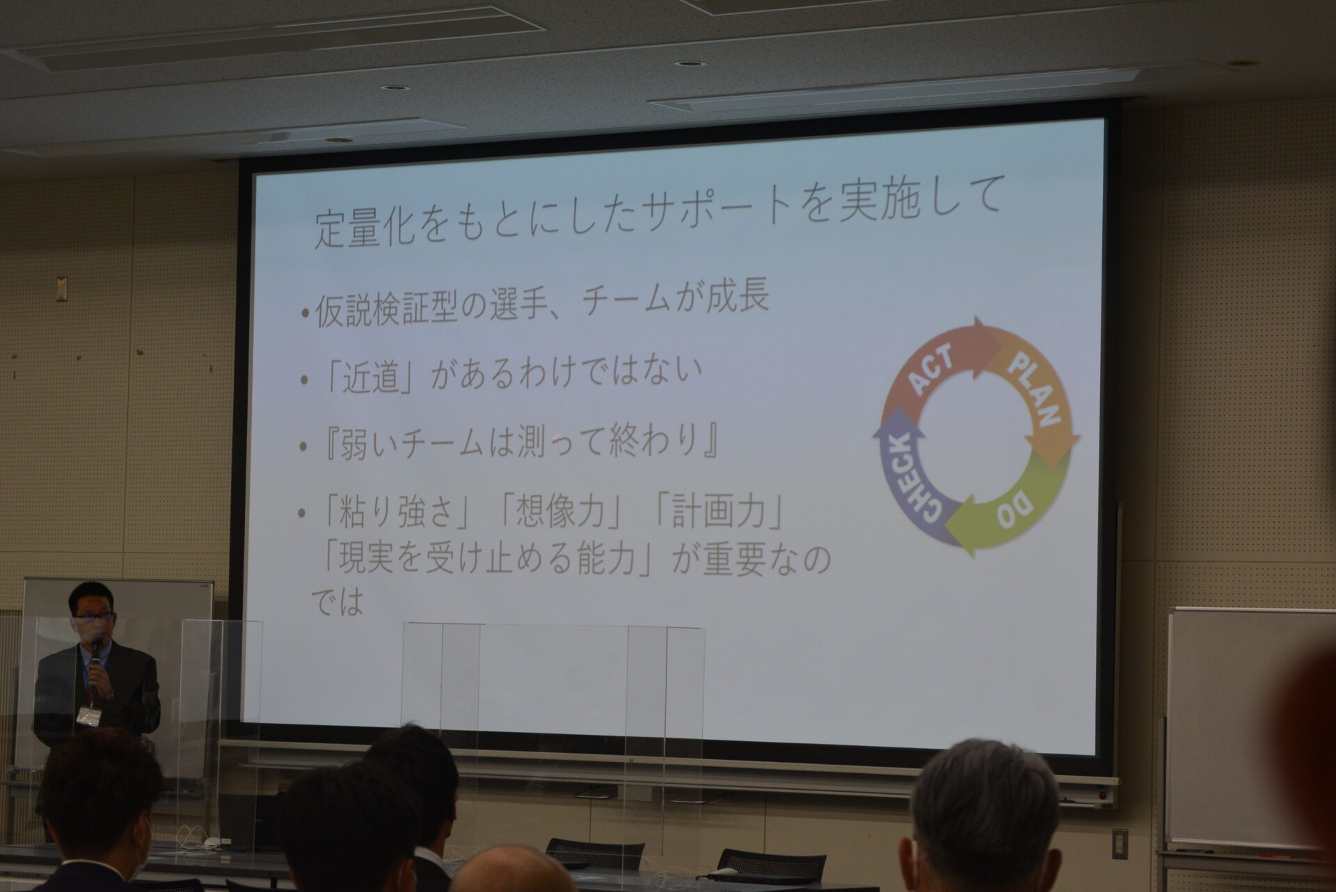 今回のシンポジウムでは、林准教授のこれまでの研究だけでなく、慶應義塾大学野球部助監督時代の経験なども踏まえて定量的データが選手、チームの成長につながったかの成功例が数多く紹介された。