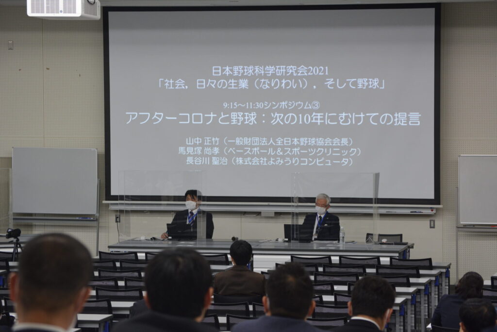 2日目は、「アフターコロナと野球:次の10年にむけての提言」をテーマに、全日本野球協会会長の山中正竹氏、株式会社よみうりコンピュータの長谷川聖治氏、ベースボール&スポーツクリニックの医師である馬見塚尚孝氏がシンポジストとなり、独自の見解を含めて、さまざまな意見が交わされた。