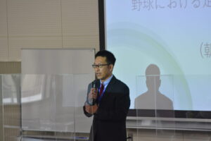 トップバッターとして研究発表を行ったのは、林卓史氏(朝日大学保健医療学部健康スポーツ科学科准教授)。慶應義塾大学野球部の助監督も経験した林氏は、現在注目されている“データ”に着目した「野球における定量的データをもとにしたサポート」をテーマに研究結果を披露した。