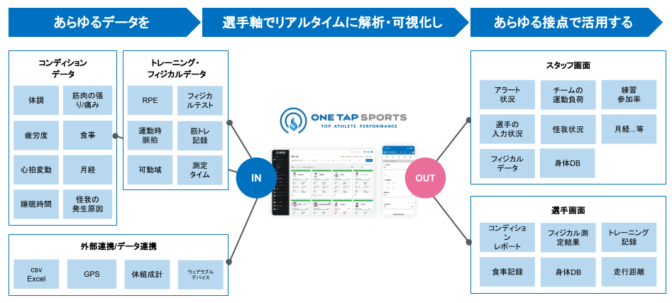 ワンタップスポーツは「コンディション」や「トレーニング」「フィジカル」「インジュリー(負傷)」などに関わるデータを選手による入力または計測機器によって集め、選手たちの運動量や疲労、コンディション、成長を管理していく。入力する項目はチームによってカスタマイズでき、下記のような入力項目が設定できる。