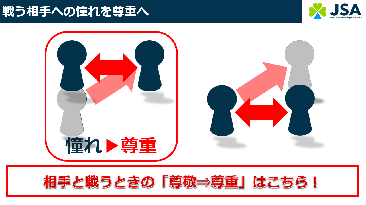 対戦相手は、自分たちを全力で倒そうとしてくる存在である。自分たちから最も遠い立場の存在であるともいえる。しかしながら、その対戦相手がいてくれるからゲームを愉しむことができるのであり、私たちがスポーツを愉しむうえで重要なパートナーであると理解して大切にすることが必要になる。