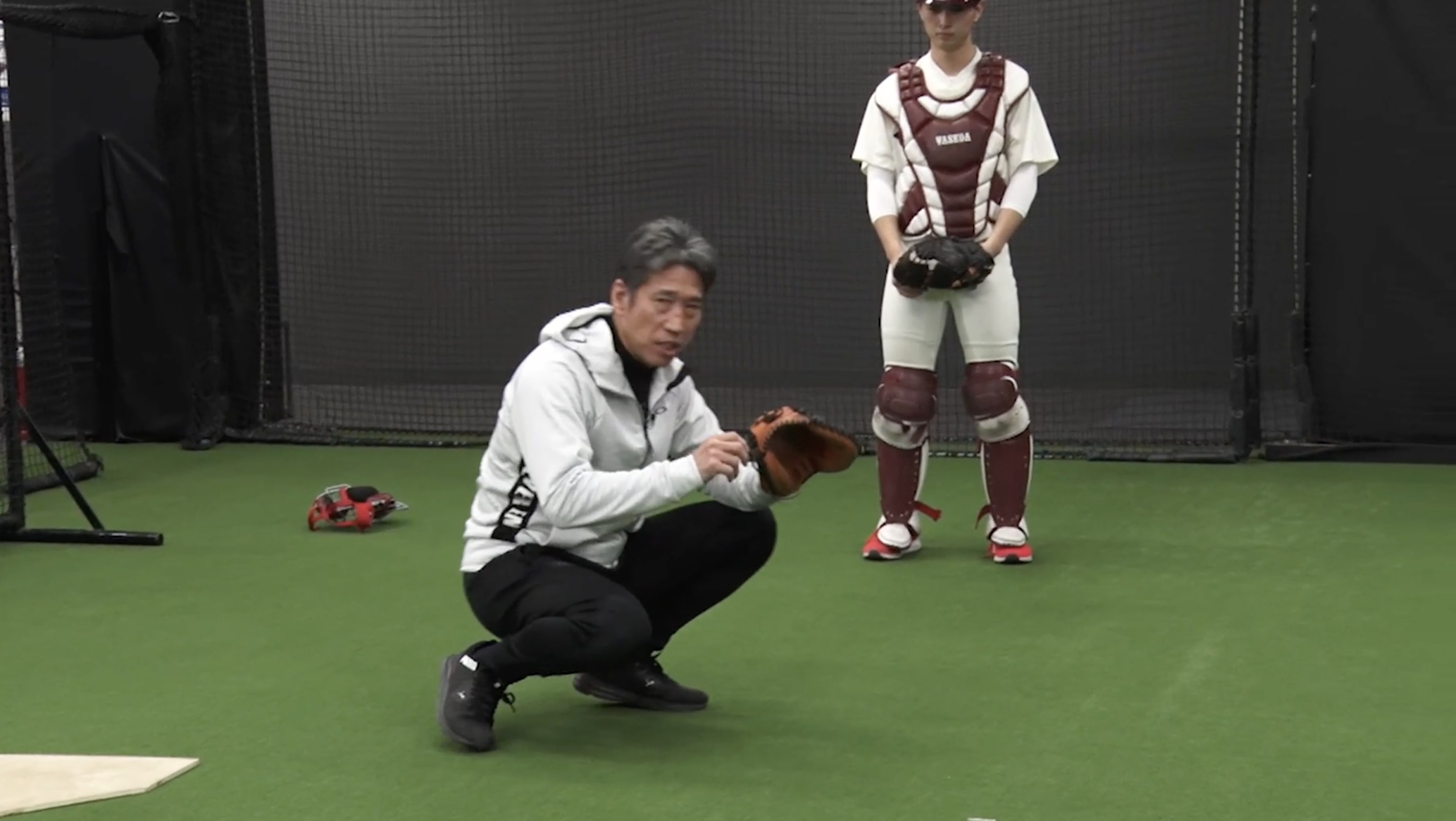 捕手としてまず、大事なのは構えだと説く野口氏。その理由を2つ示した。
