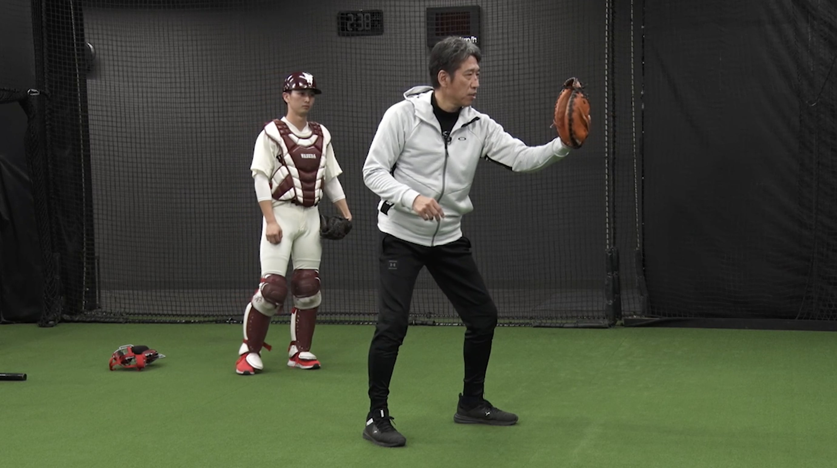 そのための練習として、足踏みをしながら捕球に移る方法だった。ここでは下半身の動きから説明した。