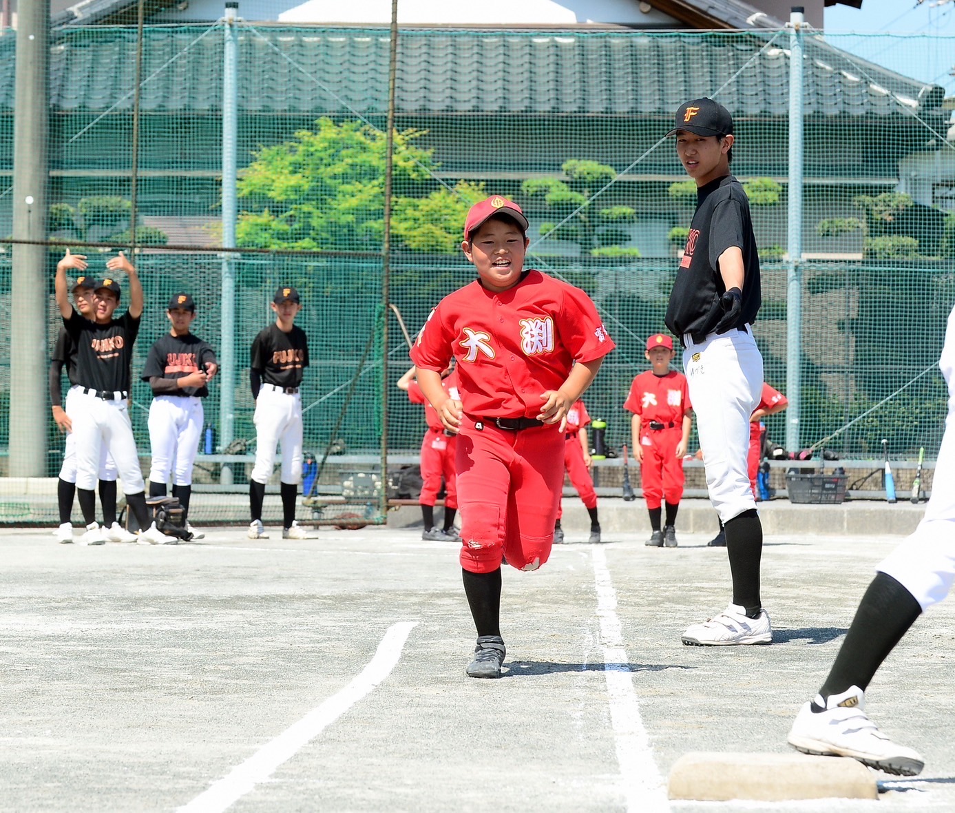この日の野球教室では、一つの工夫がなされた。一塁ベースの少し先に高校生が立ち、「お兄さんとハイタッチするまで、全力で走って行こう」と自然の流れで全力疾走できるようにしたのだ。
