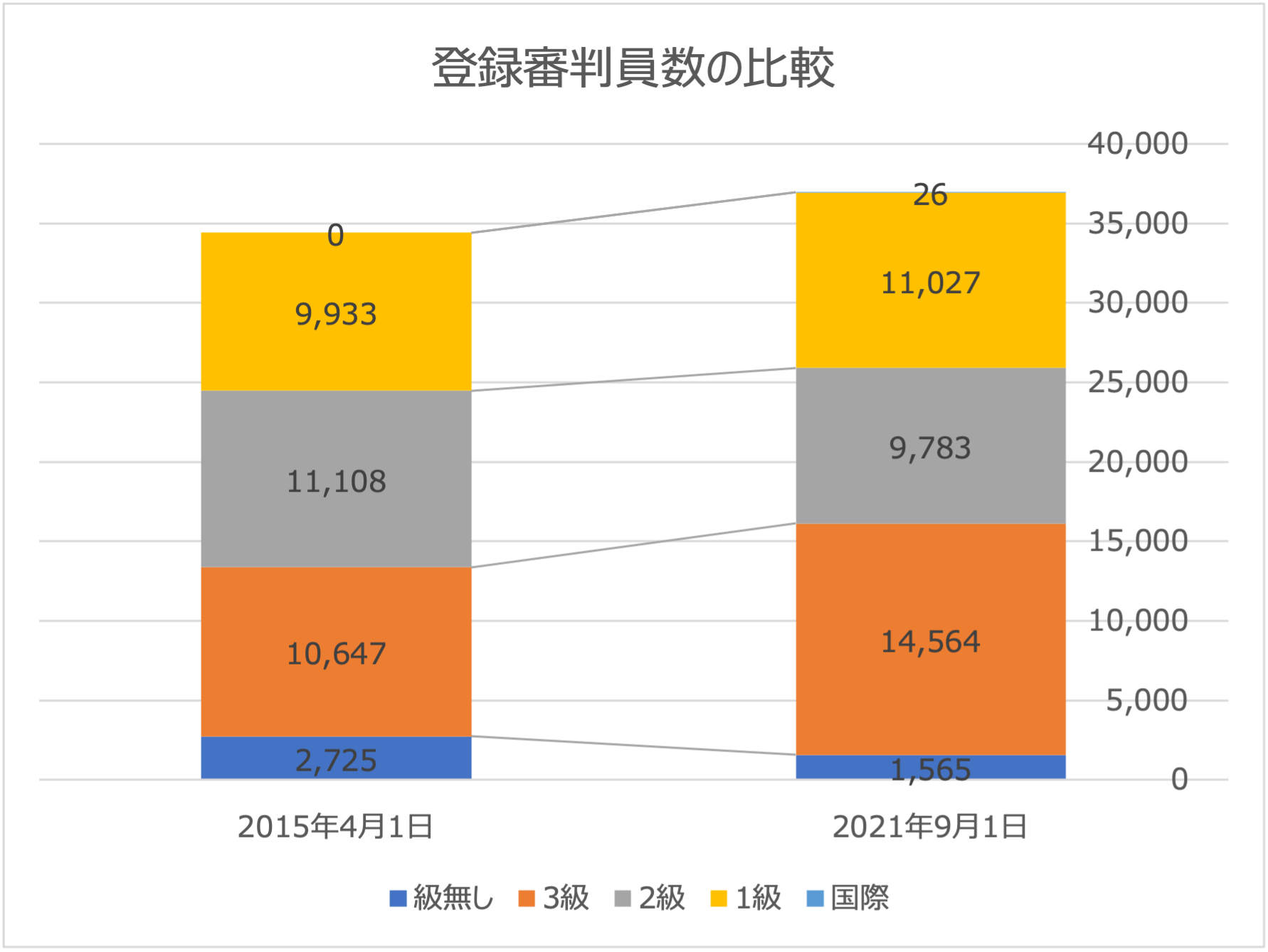 現在、制度スタートから約6年半が経過し、2021年9月1日現在の登録数は総数36,965名、うち国際が26名(0.07%)、1級が11,027名(29.8%)、2級が9,783名(26.5%)、3級が14,564 名(39.4%)、級なしが1,565名(4.2%)となっています。登録審判員数やその変遷については、後日改めて記事をご用意する予定です。