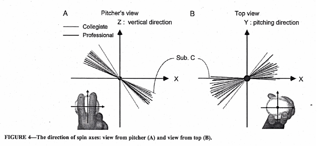 日本の大学生とプロ野球の投手が直球を投げた時の回転軸は、右投手が捕手方向を見て右下がり平均32°(下左図)、上から見ると進む向きと直角よりは1塁側が平均19°前向き(下右図)でした(Nagami et al., 2011)。回転軸を進む向きと直角にするのは難しく、こうした回転軸の傾きのおかげで直球はほとんどシュートします。