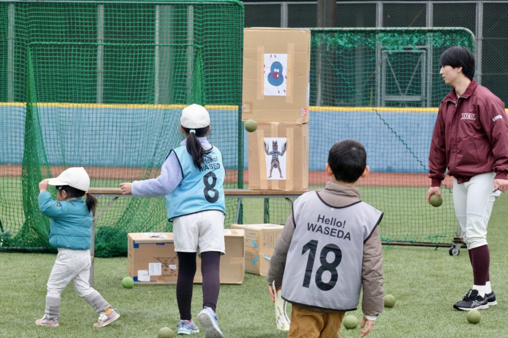 実施内容は各大学で異なる。2025年の早大では「ダンボール倒し」「駆け抜けボール鬼」「かんたん野球」「ボッチャ」など10個のあそびブースを設置し、約30人の大学4年生の部員が子どもたちと遊んだ。用意されたゲームを行うだけでなく、空いたスペースでは親子がキャッチボールを行うなど、各自が自由にすごせる公園のような光景が広がっていた。