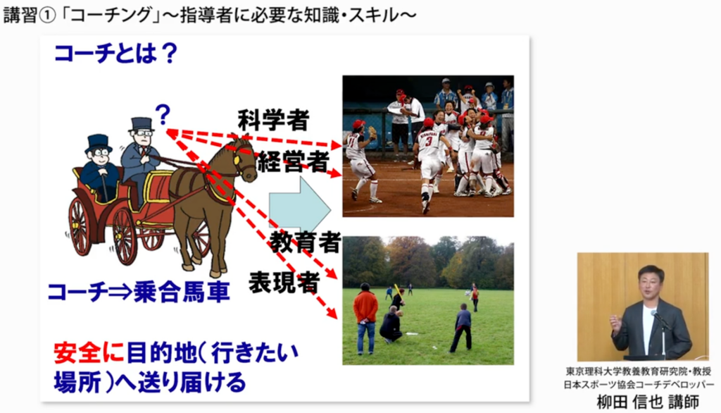 講義では始めに、コーチという言葉の語源について解説した柳田氏。