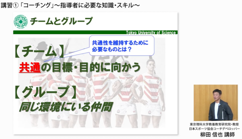 「チームは共通の目的に向かう集団。グループは一緒にいる同じ環境にいる仲間です」とした上で、チームにあるのが“共通性”であり、それを支えるのが理念・目的・目標の構造であると説いた。