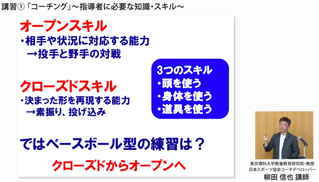 野球は相手や状況に対応する能力である“オープンスキル”と、決まった形を再現する“クローズドスキル”の2つで成り立っていると説明。